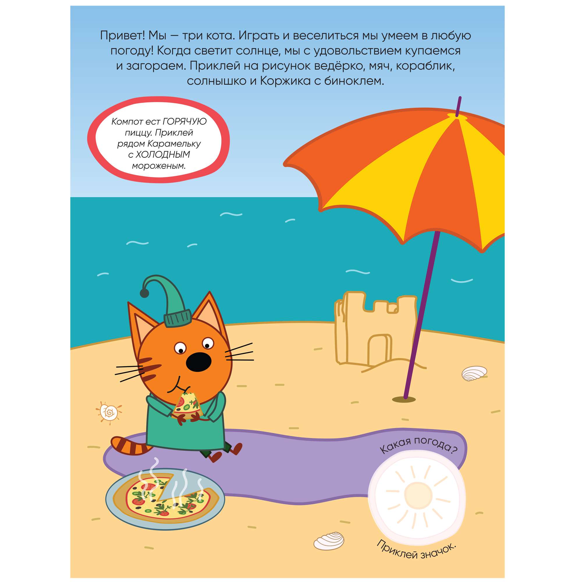 Благодаря удобному формату заниматься по книге «Погода» из серии «Три кота. Развивающие наклейки» можно где угодно: дома, в поездке, гостях и на прогулке.