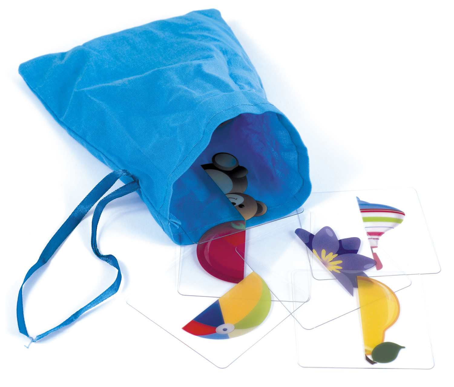 Набор "Половинки" - это комплект из трёх развивающих игр. В него входит: 9 картонных двухсторонних карт с рисунками, 54 прозрачные пластиковые карточки в мешочке, блокнот с творческими заданиями и набор цветных восковых мелков.