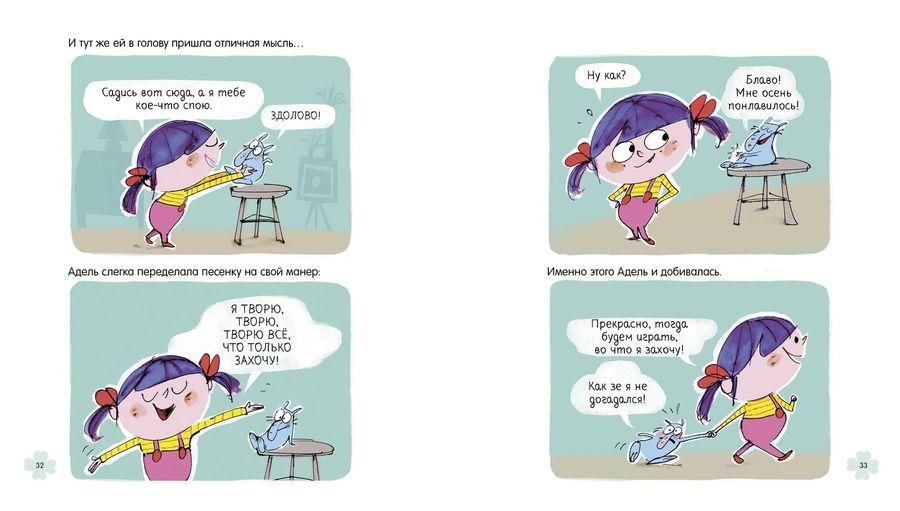 «Скучно? Маленькая Адель не знает такого слова! А ну-ка, раз-два-три! Она всегда находит себе развлечение, даже если приходится долго ехать в машине, если родители решили поспать подольше в выходной день, если на ужин нужно съесть целую тарелку супа! Будьте осторожны, воображение — очень заразная штука».