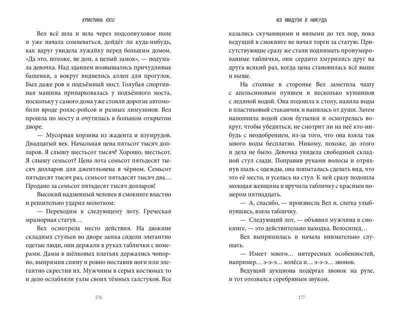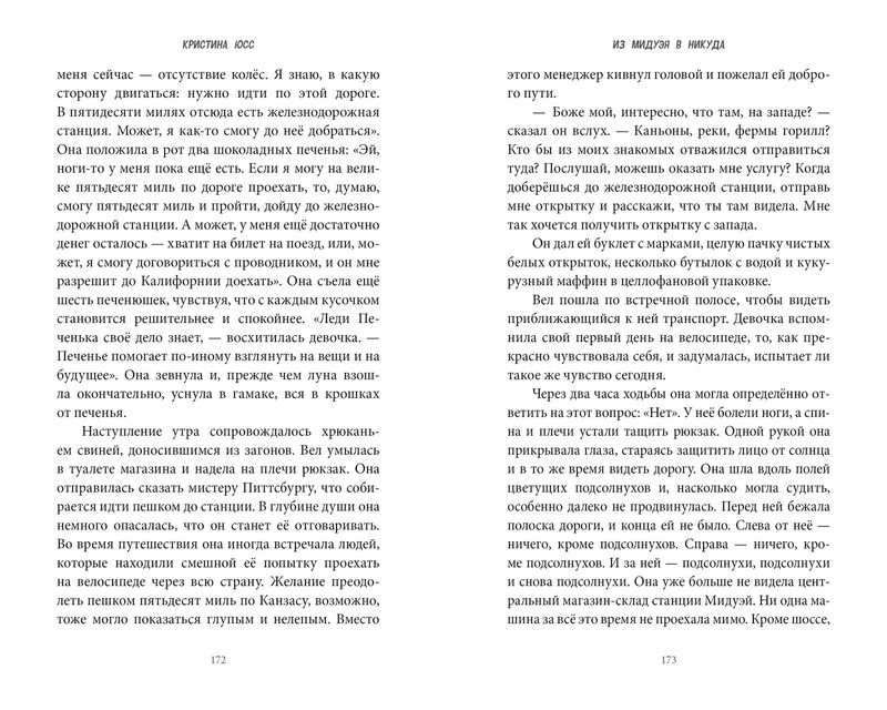 «Вел пошла по встречной полосе, чтобы видеть приближающийся к ней транспорт. Девочка вспомнила свой первый день на велосипеде, то, как прекрасно чувствовала себя, и задумалась, испытает ли такое же чувство сегодня. Через два часа ходьбы она могла определённо ответить на этот вопрос: «Нет». У неё болели ноги, а спина и плечи устали тащить рюкзак. Одной рукой она прикрывала глаза, стараясь защитить лицо от солнца и в то же время видеть дорогу. Она шла вдоль полей цветущих подсолнухов и, насколько могла судить, особенно далеко не продвинулась. Перед ней бежала полоска дороги, и конца ей не было. Слева от неё — ничего, кроме подсолнухов. Справа — ничего, кроме подсолнухов. И за ней — подсолнухи, подсолнухи и снова подсолнухи.»