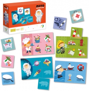 - Лото для малышей представлено красочно оформленными 6 игровыми карточками с изображением людей разных профессий и 24 прямоугольными фишками с их профессиональными атрибутами.