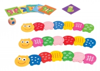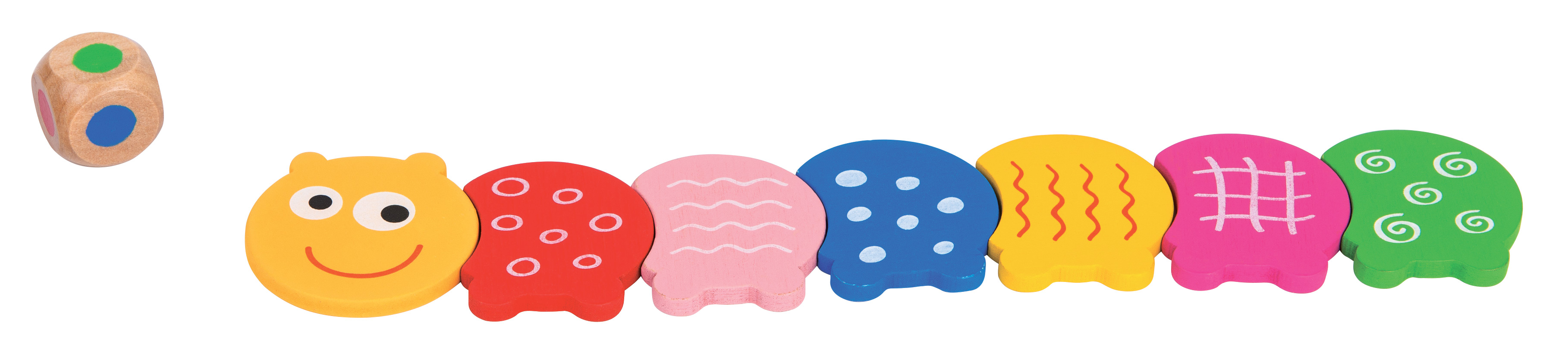 Игроки поочередно бросают кубик. В первый ход деталь пристраивается к голове гусенички, далее — друг к другу.