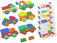 - Крохе необходимо выполнить задания с карточек и собрать из ярких деталей миниатюрные копии изображенных машинок.