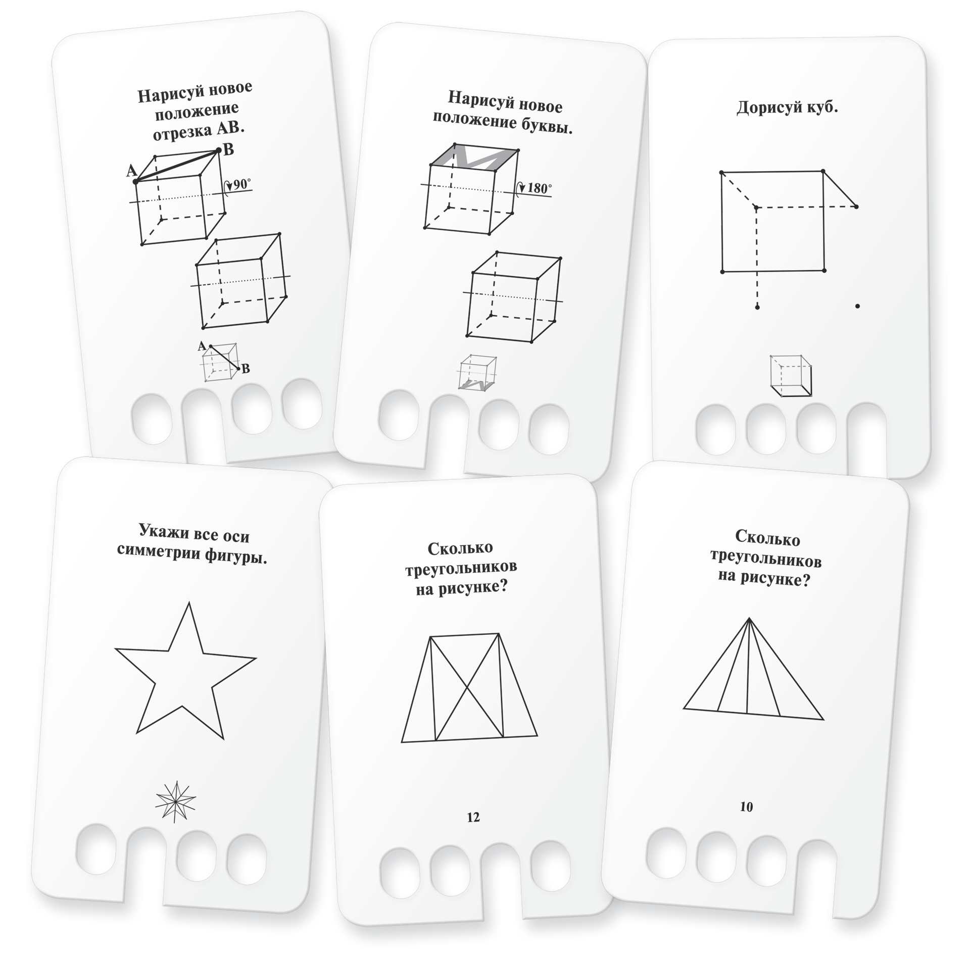 Во второй игре ребёнок будет отвечать на вопросы, рисовать, развивая пространственное мышление, закрашивать или дорисовывать грани фигур, определять оси симметрии и т. п. Ответ вписывается карандашом, затем можно вытянуть карточку из блока и проверить себя, сверяя свой ответ с правильным.