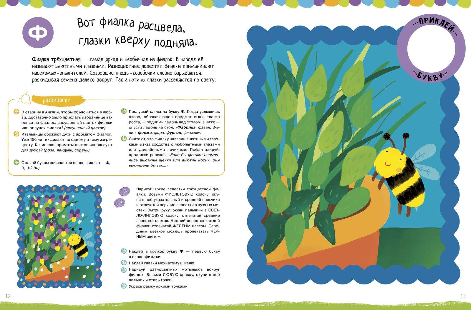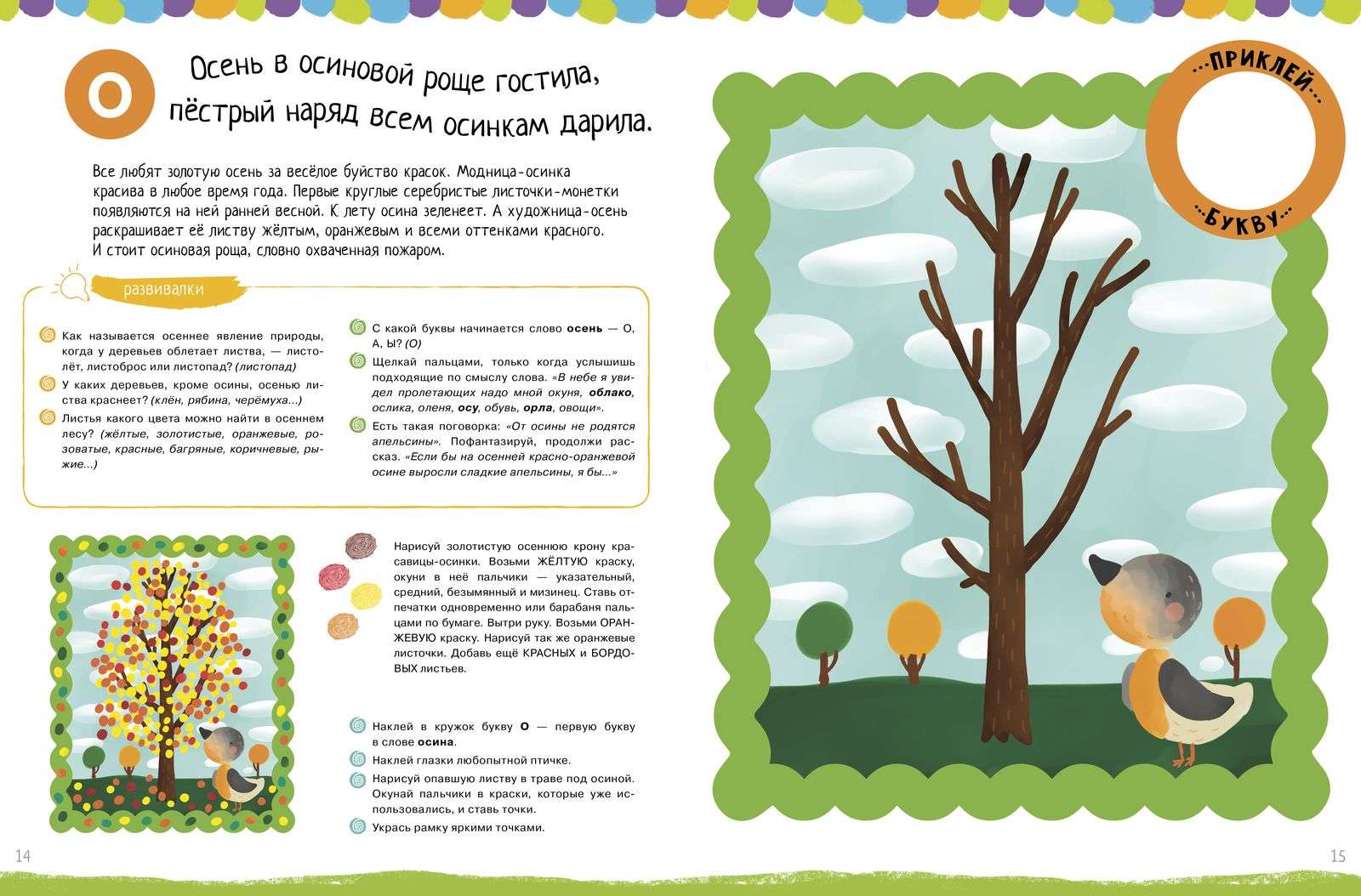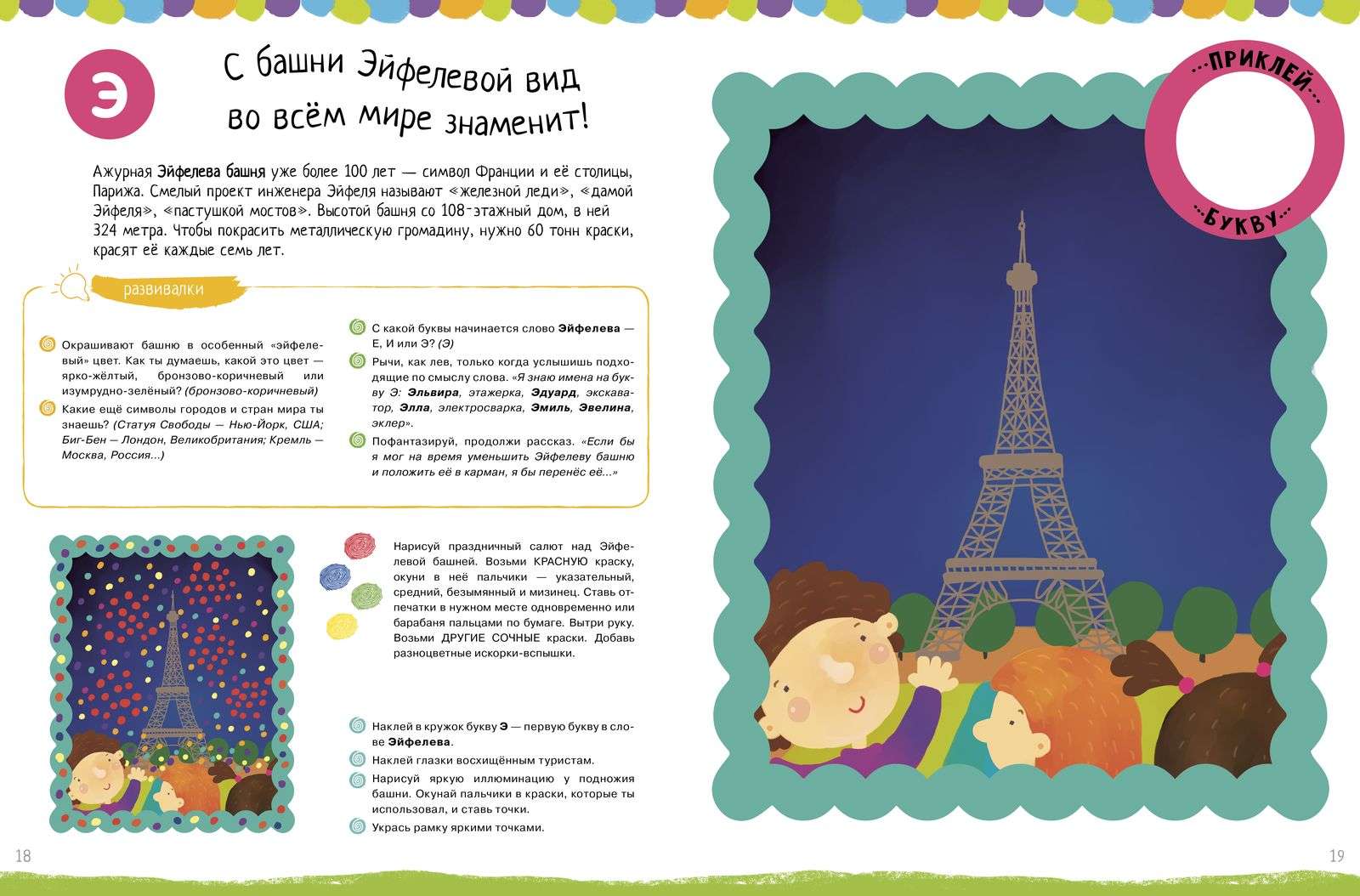 В каждом занятии вы найдёте познавательный текст для обсуждения картинки; развивающие вопросы;двустишие; задание каким цветом и как рисовать; образец, на который нужно ориентироваться; место для наклейки с буквой; глазки, чтобы наклеивать их персонажам; эскиз картинки, который будет дорисовывать ребёнок; идеи для творчества, обучающие задания