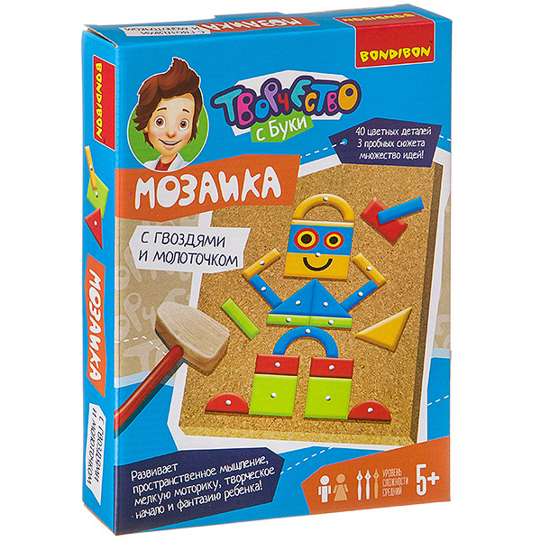 В состав входят пробковая основа, молоточек, гвоздики, яркие детали из EVA разной формы и инструкция с картинками-примерами.