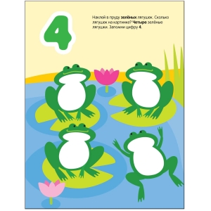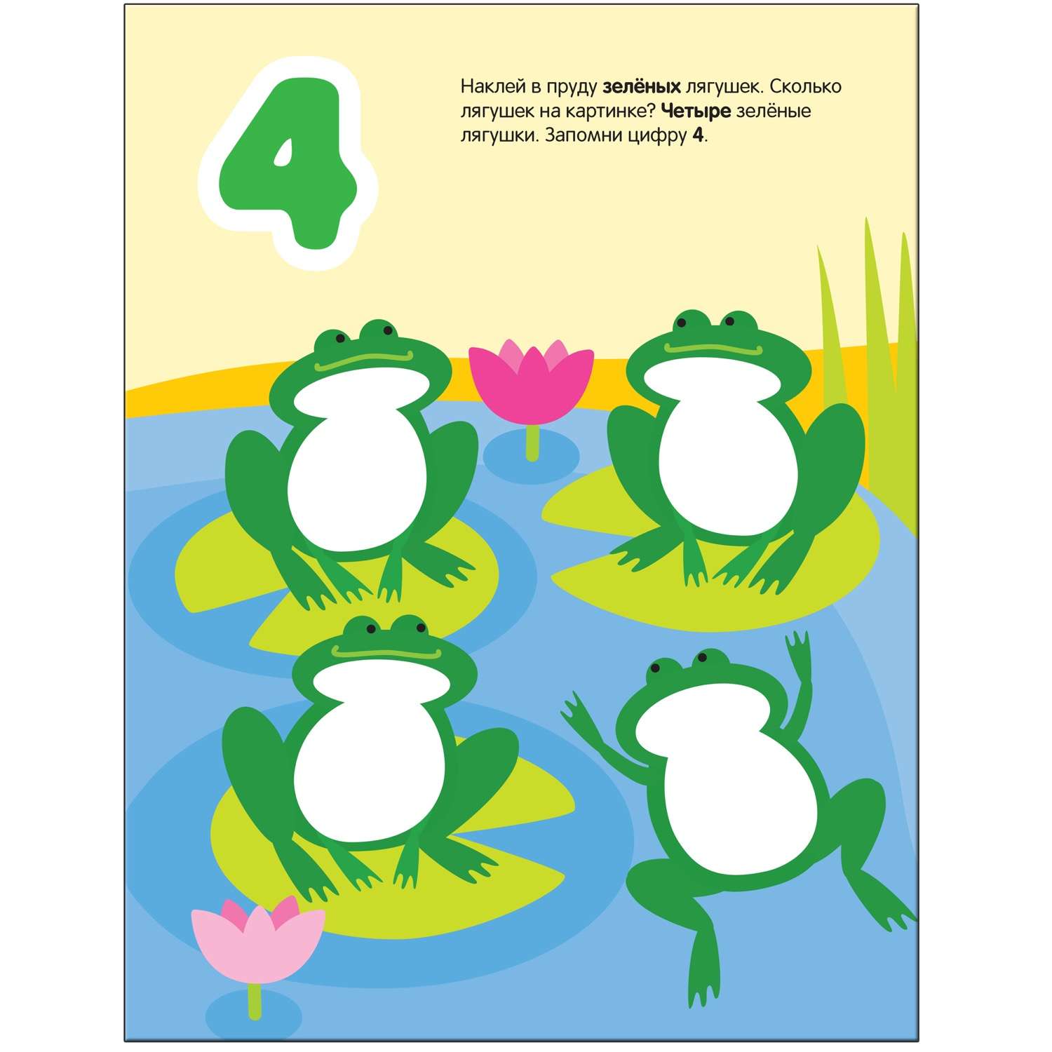 С помощью этой книги малыш познакомится со счетом (на листочки нужно наклеить двух божьих коровок, трёх пчёлок, 5 стрекоз, рядом с котёнком цифру «1», с четырьмя улитками цифру «4» и т. д.).