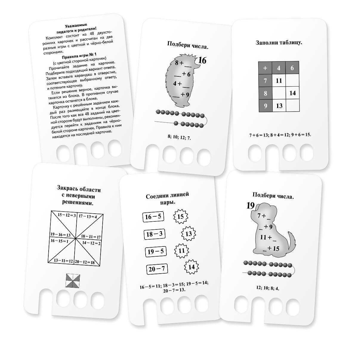 Во второй игре нужно соединять линиями пары чисел, заполнять таблицы, искать сумму, закрашивать фрагменты рисунка с правильными ответами и т. п. Ответ вписывается карандашом, затем можно вытянуть карточку из блока и проверить себя, сверяя свой ответ с правильным.