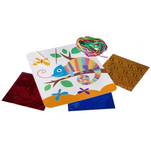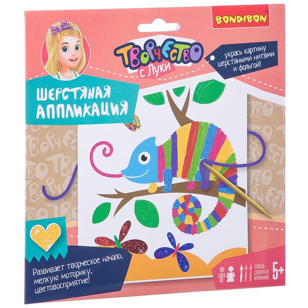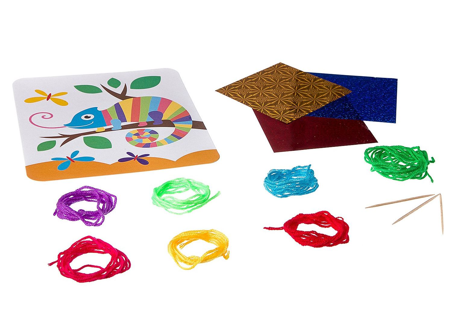 В набор входит самоклеящаяся цветная основа для картины, набор шерстяных нитей, деревянные палочки.