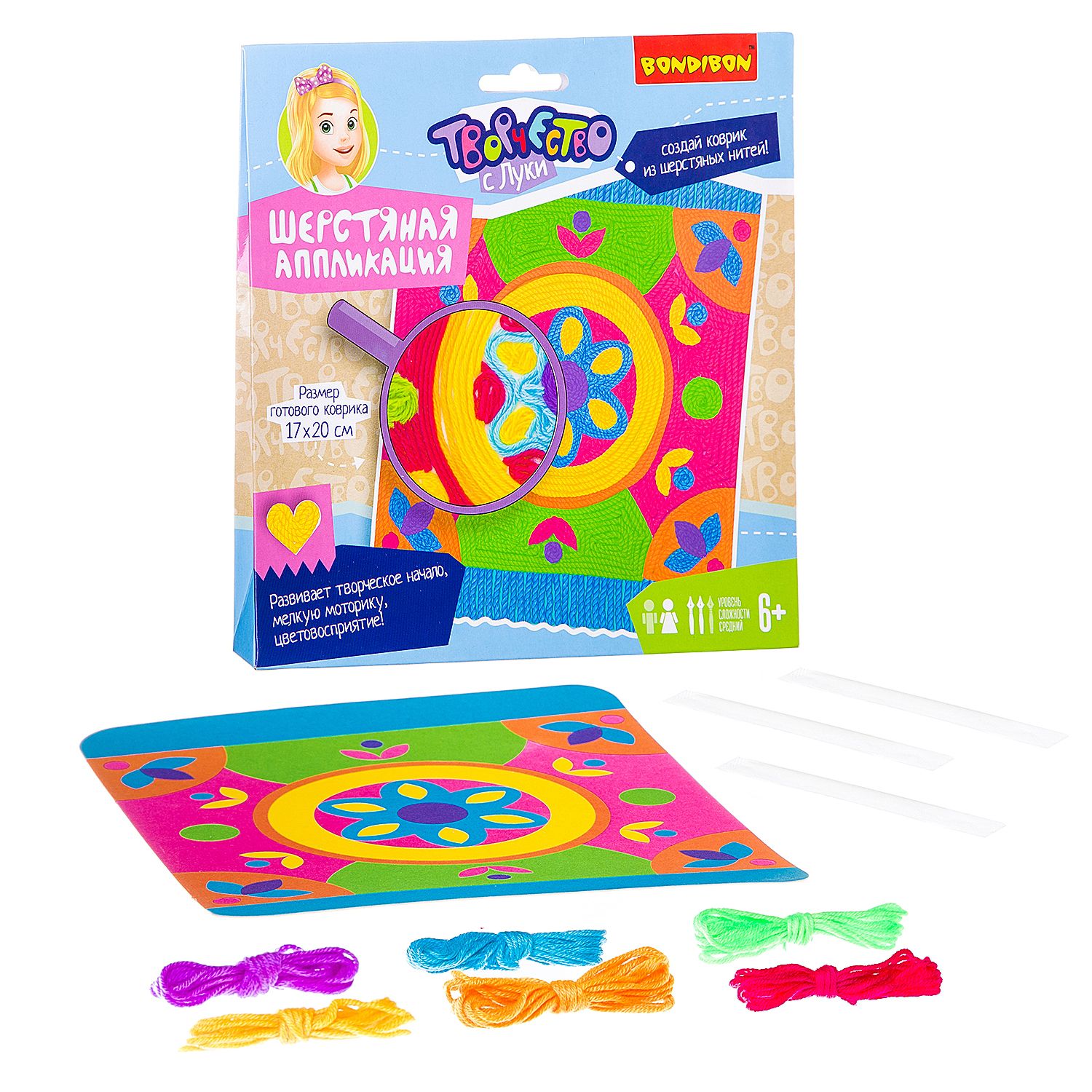 В набор входит самоклеящаяся цветная основа для картины, набор шерстяных нитей, деревянные палочки.