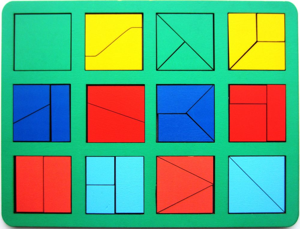 В набор входит: планшет с выемками для квадратов (31,5*24см) и 12 разрезных квадратов (6*6см)