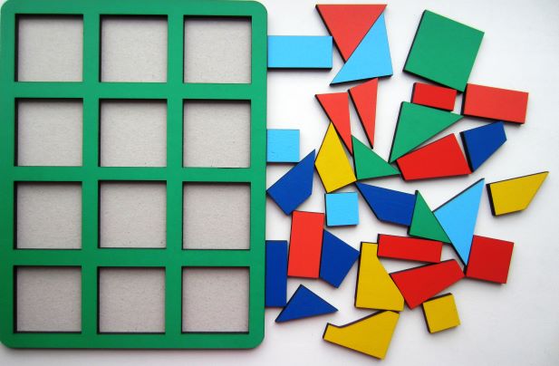 12 квадратов ребенку предлагается собрать из частей:треугольников, прямоугольников и других фигур. Второй-третий уровни сложности будут интересны даже взрослым!