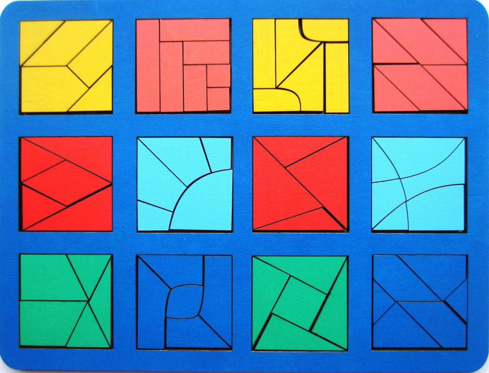 12 квадратов ребенку предлагается собрать из частей:треугольников, прямоугольников и других фигур. Второй-третий уровни сложности будут интересны даже взрослым!