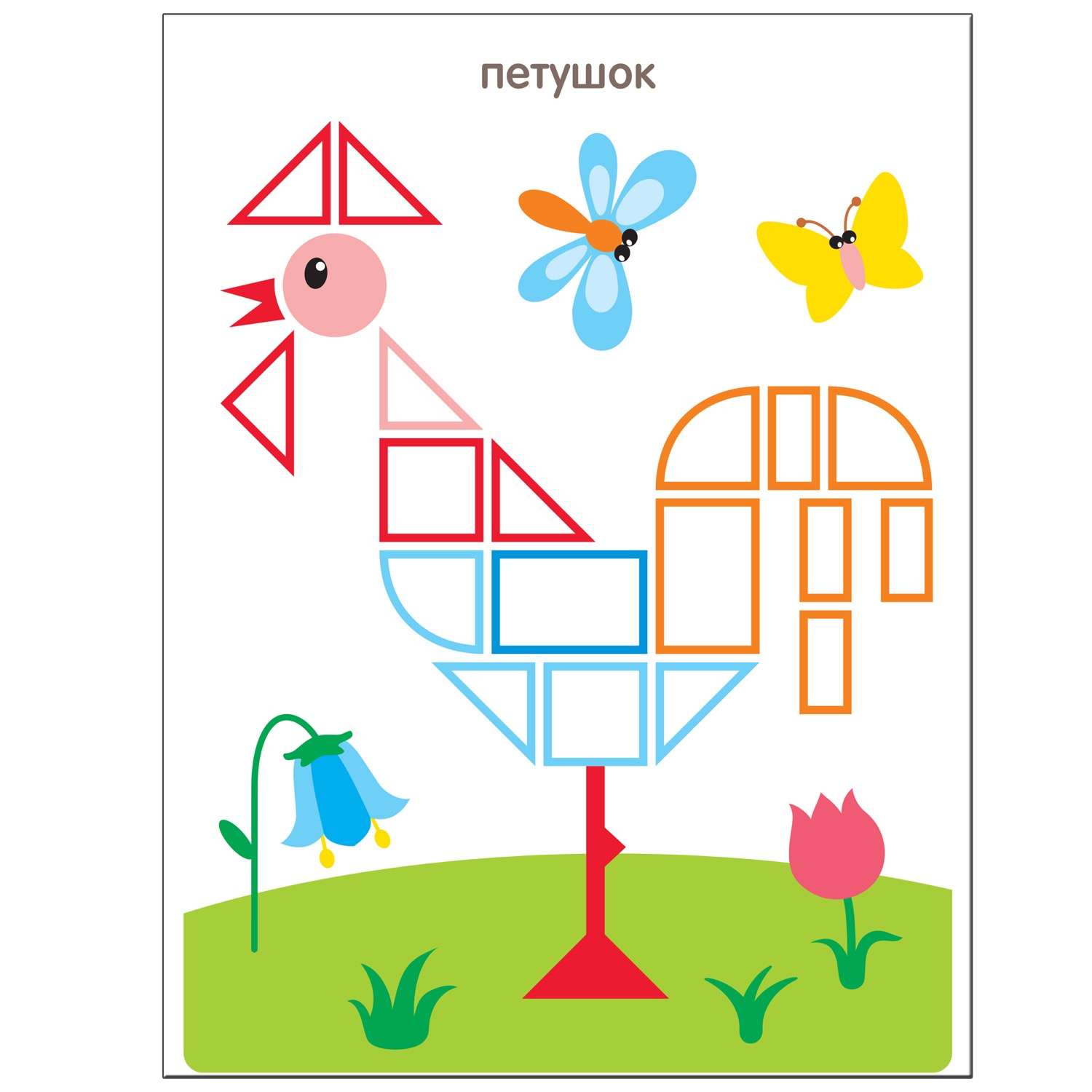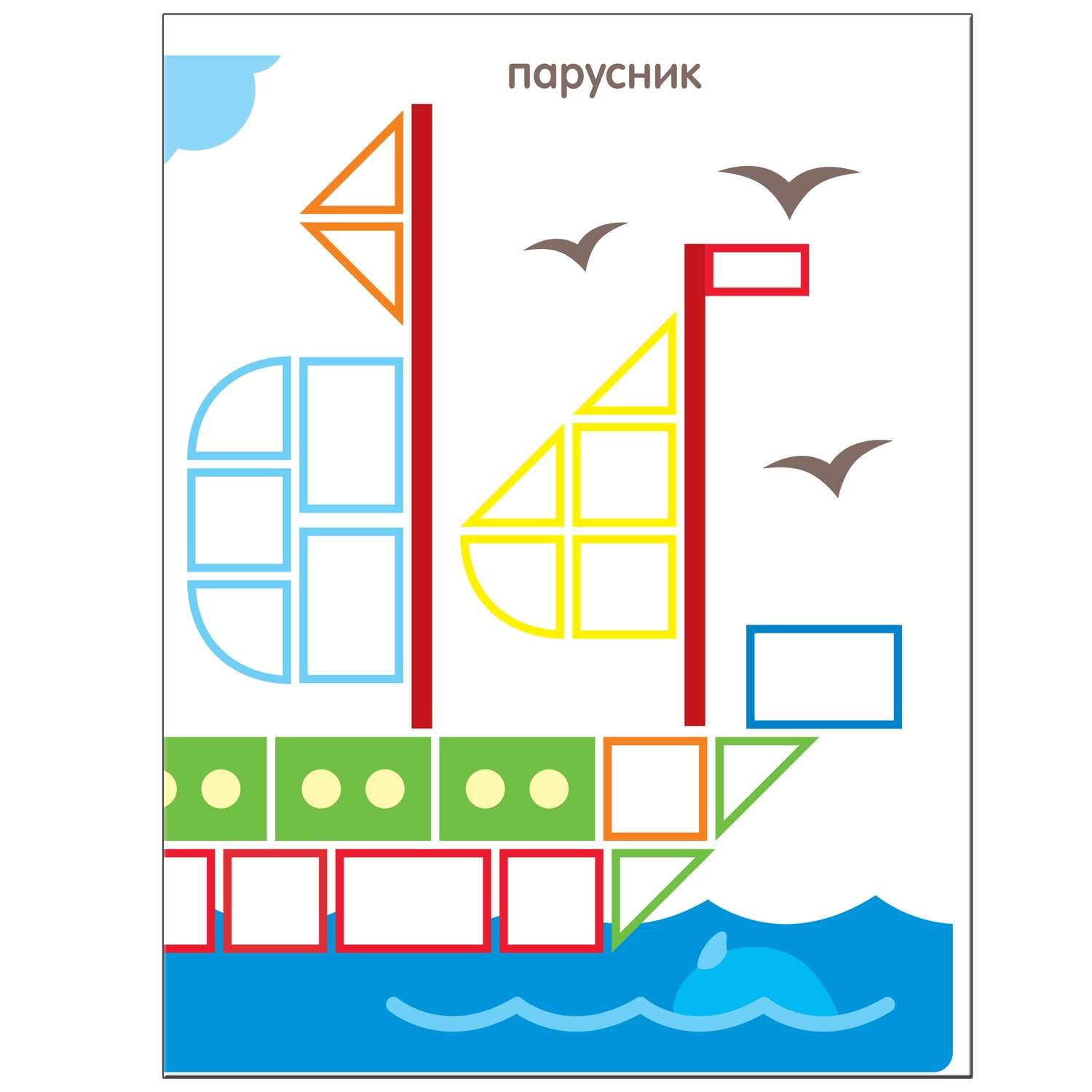 Каждая фигура имеет рамочку определенного цвета – ориентир для юного художника, который «раскрасит» картинки разноцветными наклейками.