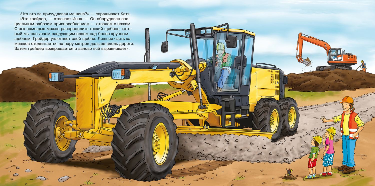 На каждом книжном развороте внимание Вашего малыша привлекут красочные тщательно прорисованные изображения специальных машин, используемых на различных этапах, связанных со строительством автодорог. Это гусеничный экскаватор с огромным ковшом и мощный самосвал, выравниваюший дорожное покрытие бульдозер и уплотняющий слой щебня грейдер, асфальтоукладчик и дорожный каток, бетономешалка и подъёмный кран.