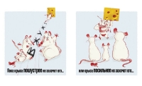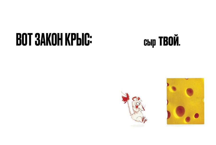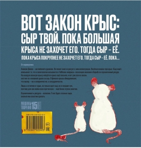 Закон крыс краток и прост: сыр твой. А значит, если большая крыса захочет его - сыр её. Если, конечно, сильная крыса не захочет его - тогда сыр её. Но только до тех пор, пока страшная крыса не захочет его; если страшная крыса захочет сыр - он её. Будь вы большая крыса или сильная, шустрая или страшная, мохнатая или грязная - или даже всё разом - закон для всех один, и каждая крыса знает его. Но кому же тогда достанется сыр, кому повезёт съесть его?