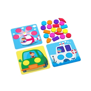 - Игровые атрибуты представлены карточками с изображением разного вида транспорта: кораблика, вертолета и даже ракеты и деталями разных форм и цветов, выполненные из ЭВА материала.