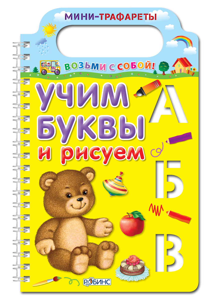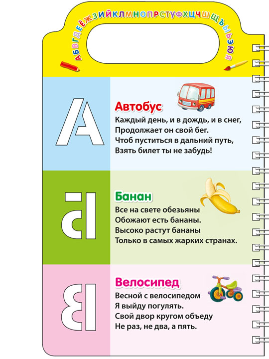 - Множество трафаретов с буквами, веселые стихи для запоминания, а также красочные картинки с подписями.