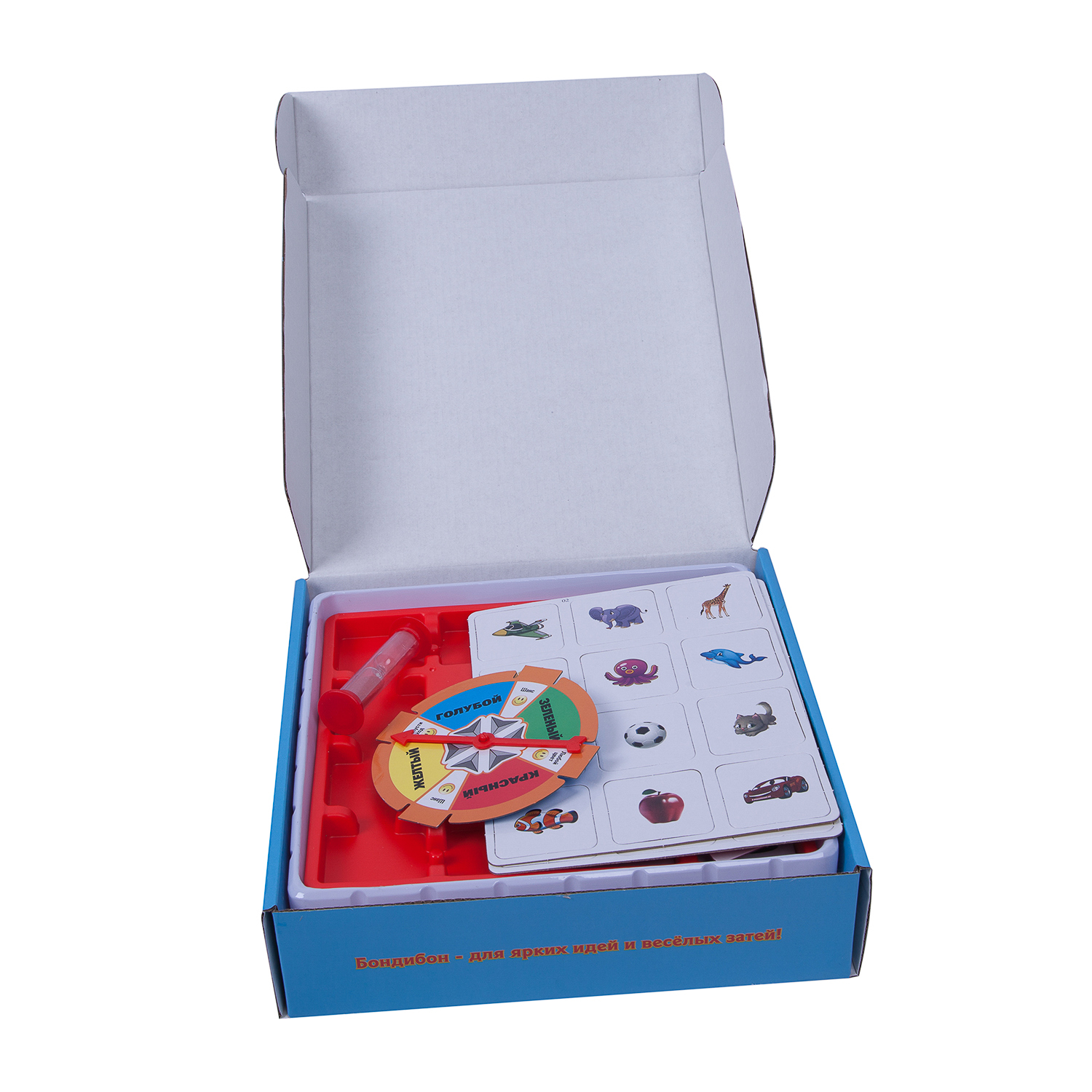 Разместите на середине игрового поля рулетку, а карточки - по краям, картинкой вверх. Переверните песочные часы. Игра началась.