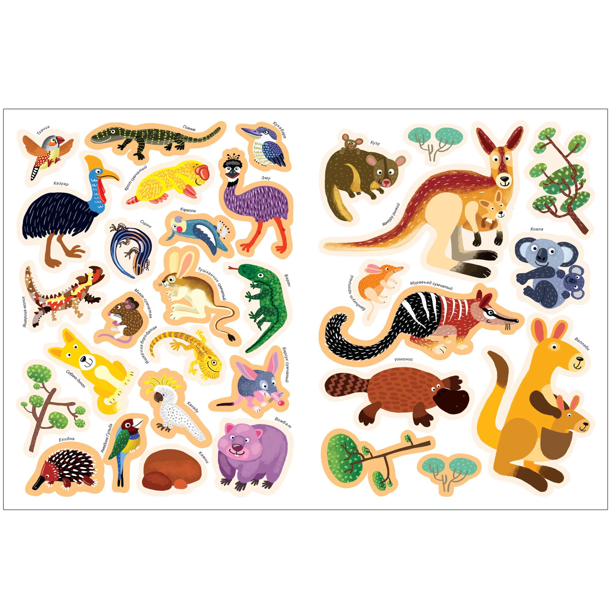 Помимо множества занимательных фактов внутри книги малыша ждет сюрприз – большая панорамная иллюстрация с изображением австралийского пейзажа. Дополняя ее яркими многоразовыми наклейками – животными Австралии, он не только закрепит новые знания, но и создаст красочный плакат, которым можно украсить стены комнаты.