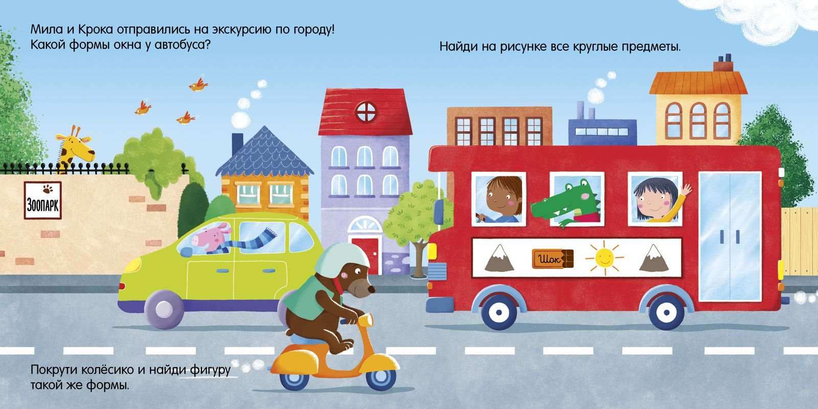Здания, машинки, вывески на магазинах помогут выучить цвета и формы, а яркие картинки не дадут заскучать.