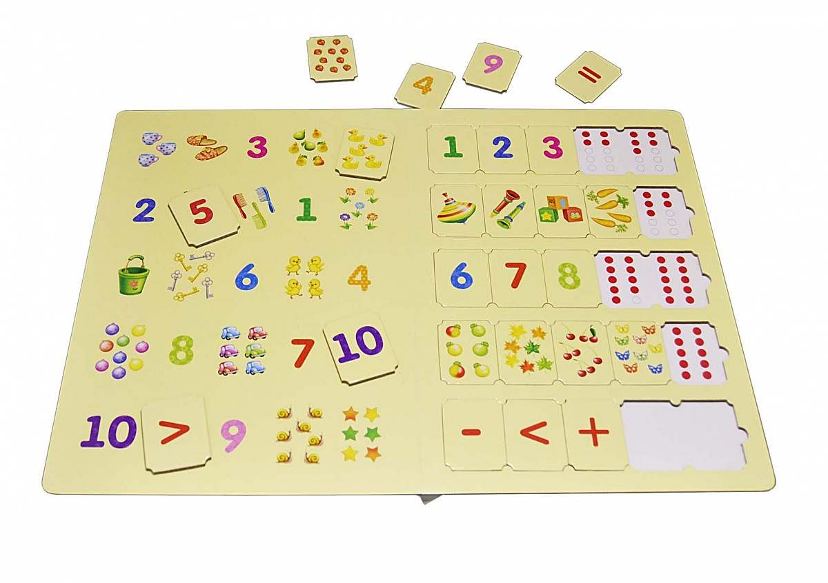 На вынимающихся пазлах нарисованы числа от 1 до 10 и предметы, которые можно посчитать. На внутренней сторонке обложки находится игровое поле с картинками и числами. Накладывайте на игровое поле квадратики-пазлы так, чтобы числа и количество предметов на картинках совпадали.