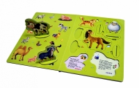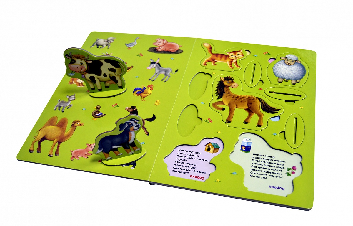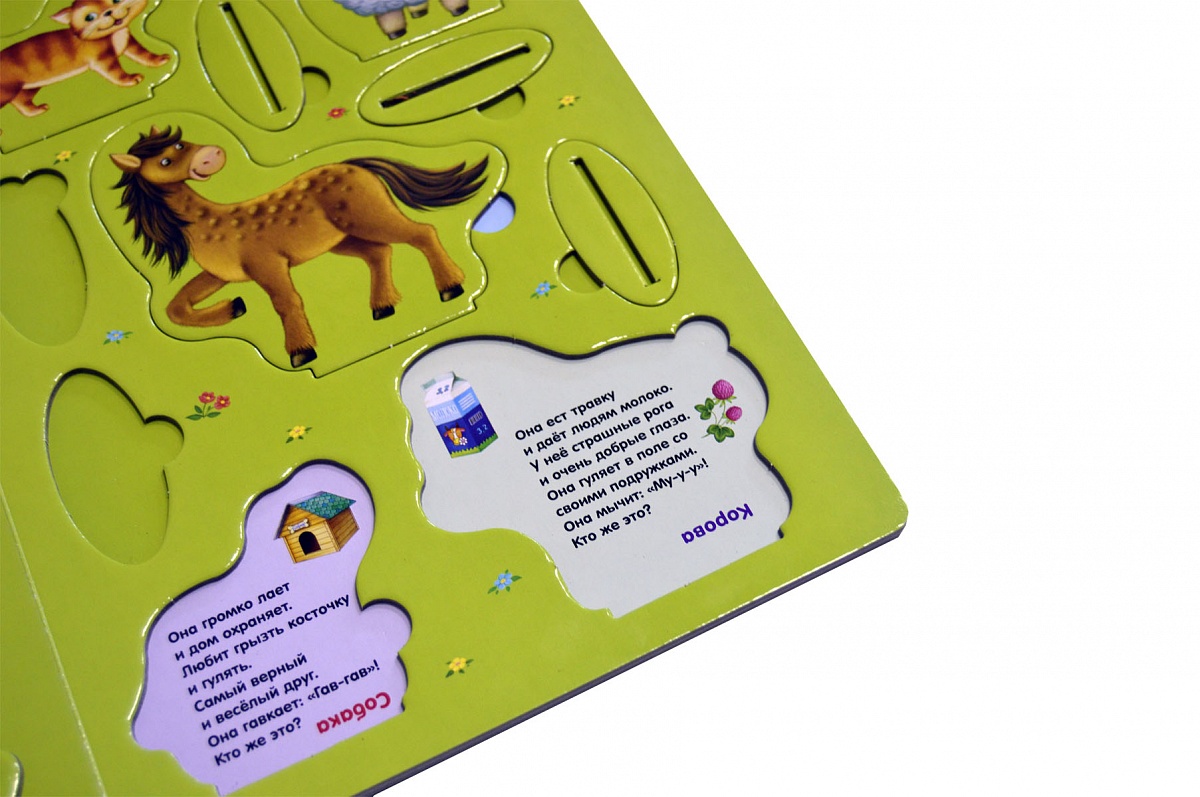 - Вытащите пазлы с изображениями животных и поставьте их в пазлы-подставки. Под изображениями животных находятся тексты с описаниями: прочитайте их малышу, обязательно озвучьте «речь» каждого животного («Мяу-мяу!», «Му-у-у!», «Бе-е-е!», «Гав-гав!», «И-го-го!»).