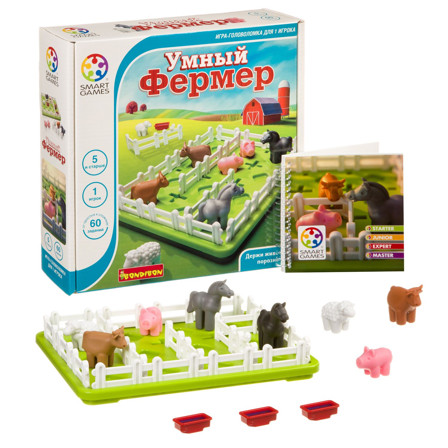 Игра содержит игровую доску с 4 зафиксированными заборами по периметру,2 фигурки лошади, 2 коровы, 2 овцы, 2 свиньи, 3 корытца с водой, 3 ограды, буклет с 60 заданиями и их решениями. Игра предназначена для одного игрока в возрасте от 5 лет.
