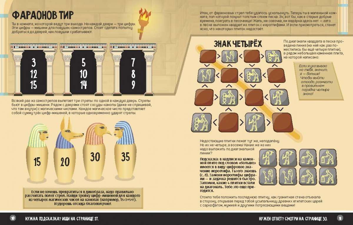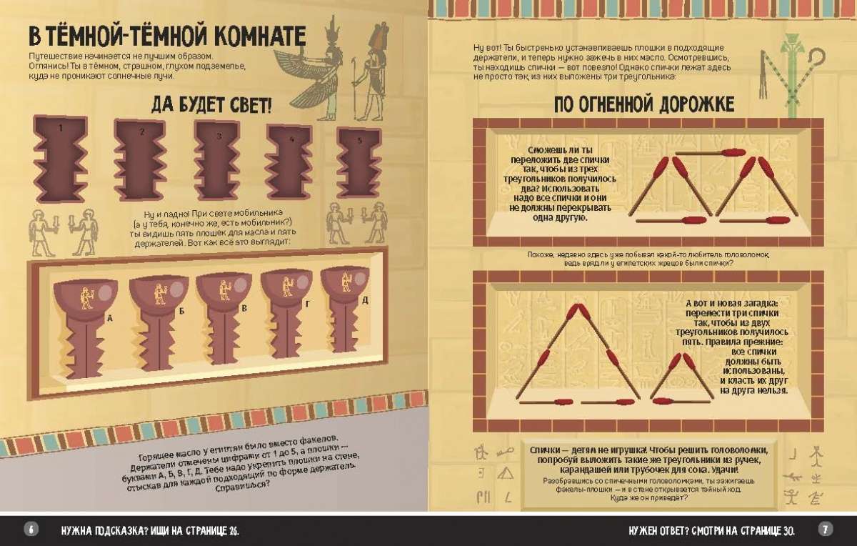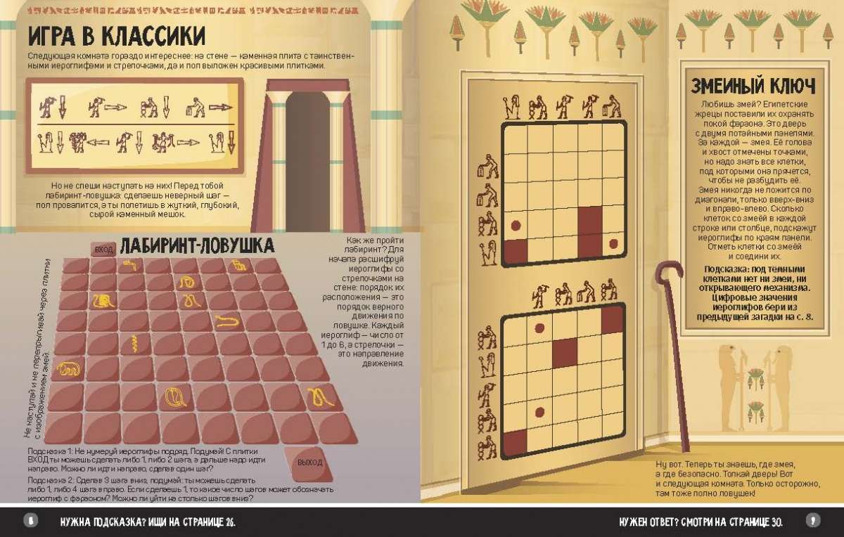 хитроумные ловушки, проклятия мумий, змеи, скорпионы и свирепый бог Анубис, покровитель мёртвых. Но не волнуйся – кто же оставит ребёнка одного в песках? Намёки и подсказки помогут решить самые каверзные задачки, а на последних страницах есть готовые ответы (только не подглядывай, пусть игра будет честной).
