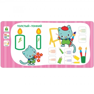 Малыш научится сравнивать и называть противоположности. Благодаря подсказкам ребенок легко сможет самостоятельно справиться с заданиями.