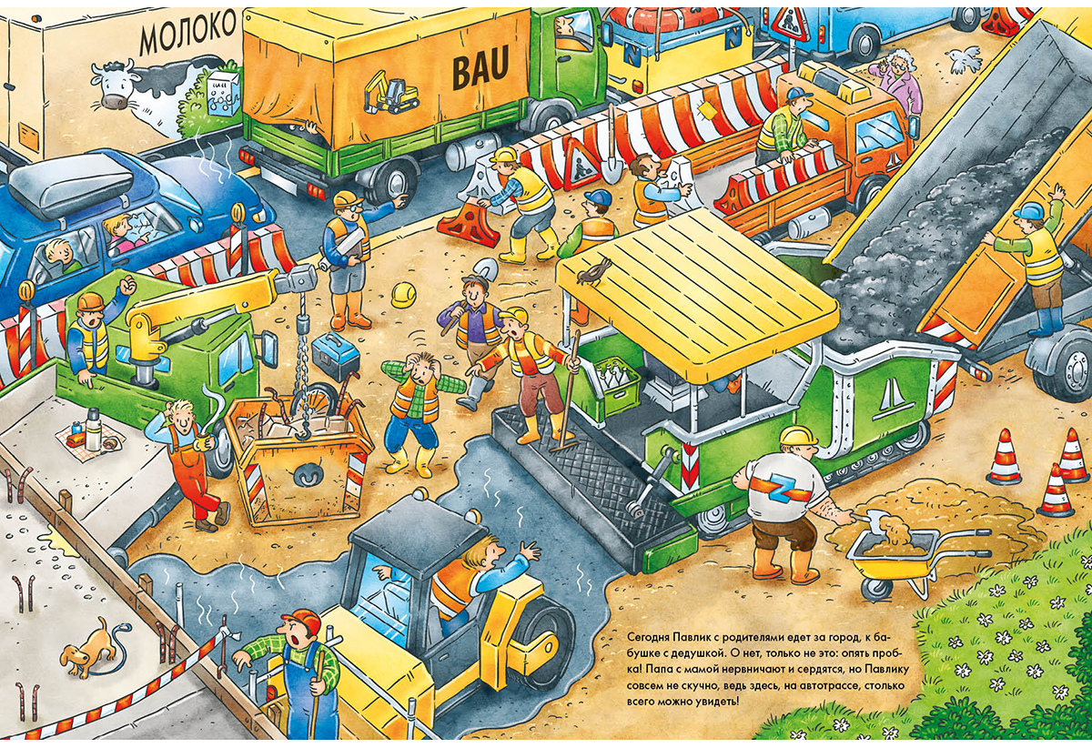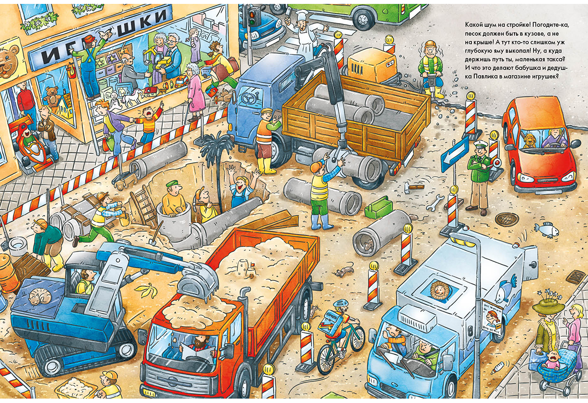 Но где же во всей этой суматохе спрятался маленький жёлтый экскаватор, который так нравится Павлику?