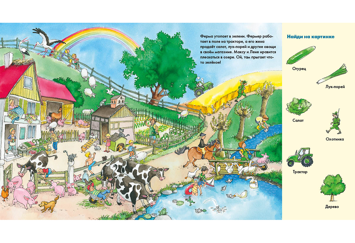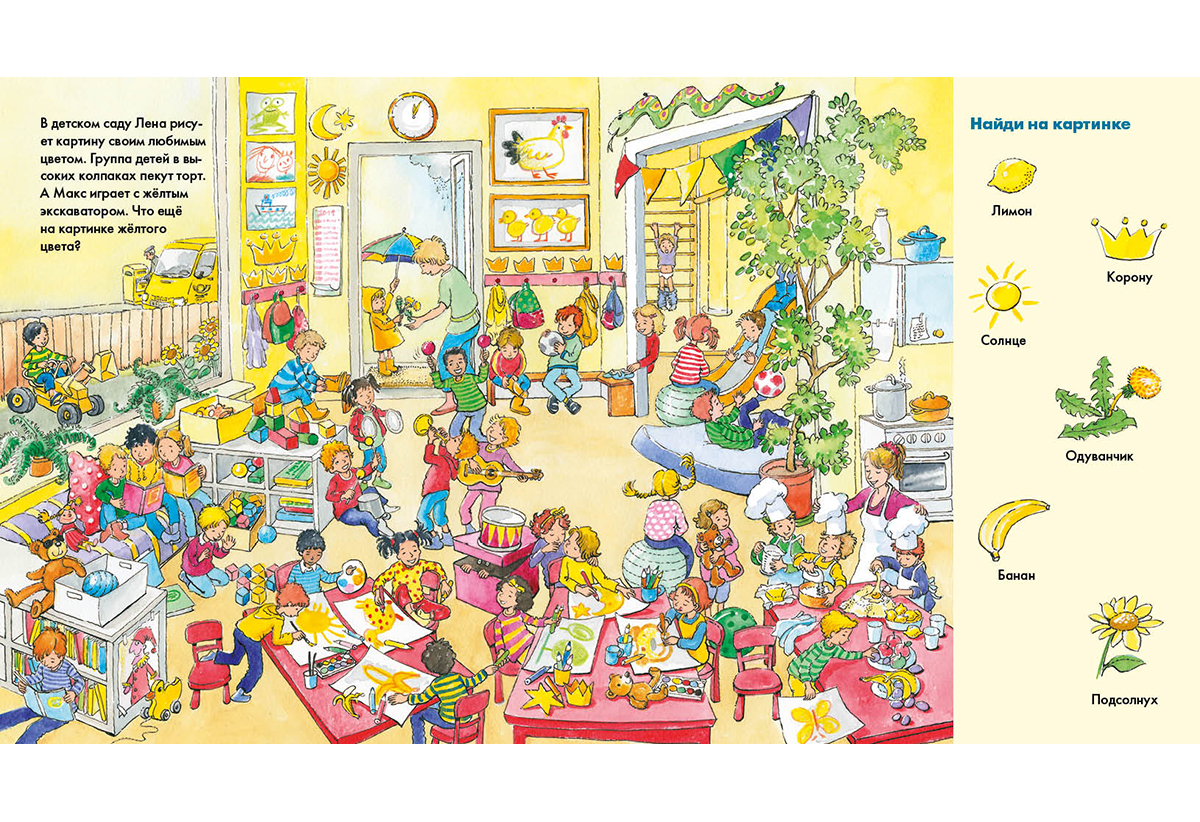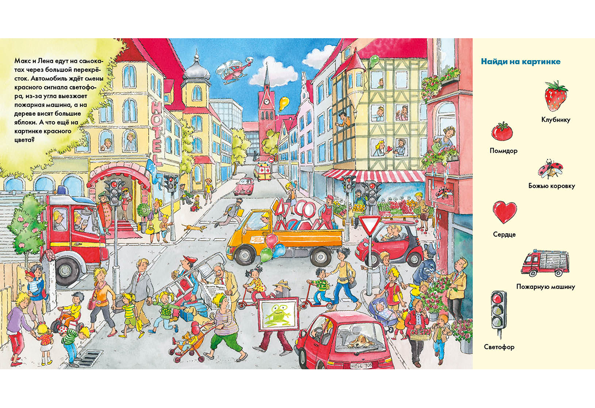 Эта книжка поможет изучить и хорошо запомнить разные цвета! В детском саду Макс и Лена нашли жёлтый подсолнух. В деревне дети увидели зелёную лягушку, а в городе покатались на красной пожарной машине!