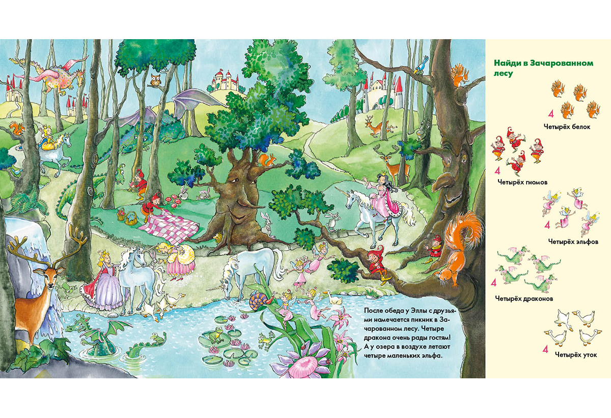 Гостей, подарков и событий столько, что и не сосчитать! У Эллы теперь есть единорог; а в кухне спрятались две мышки. Посчитай, сколько бабочек летает в Зачарованном лесу?