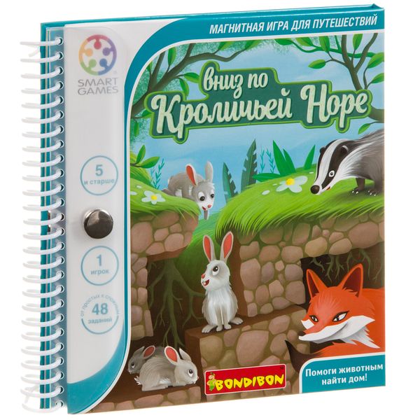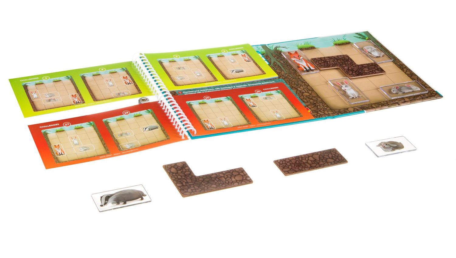 Игра содержит компактную игровую доску, 3 магнитные земляные детали головоломки, 6 магнитных деталей с изображениями животных 4 кролика, 1 лиса, 1 барсук, буклет с 48 заданиями и их решениями.