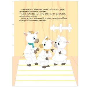 С книжкой «Волк и козлята» серии «Рисуем по точкам» Ваш ребенок почувствует себя настоящим художником. Ему предстоит создать красочные иллюстрации к любимой русской народной сказке. Для этого малышу нужно лишь аккуратно обвести пунктирные контуры, а затем раскрасить получившиеся картинки с помощью карандашей или фломастеров.
