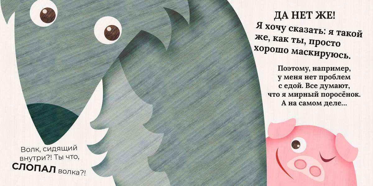 Эту весёлую историю придумала и нарисовала иллюстратор из Италии Мариса Вестита. В этой книге художница показывает детям, как могут подружиться абсолютно разные создания. Волк и поросёнок, встретившись однажды на лужайке, неожиданно обнаружили, что похожи как две капли воды!