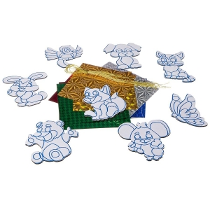 Для этого берём лист, выбираем понравившееся изображение. По контурам выбранной фигурки содержатся несколько наклеек. Аккуратно снимаем одну из них. Выбираем металлизированную плёнку по цвету, которой Вы хотите окрасить данный участок фигурки. Кладём плёнку на фигурку, таким образом, чтобы сторона с цветом, в который Вы хотите окрасить, была обращена лицом к Вам. Потрите поверхность плёнки пальцем. Теперь самое интересное. Снимаем плёнку - часть фигурки окрасилась.