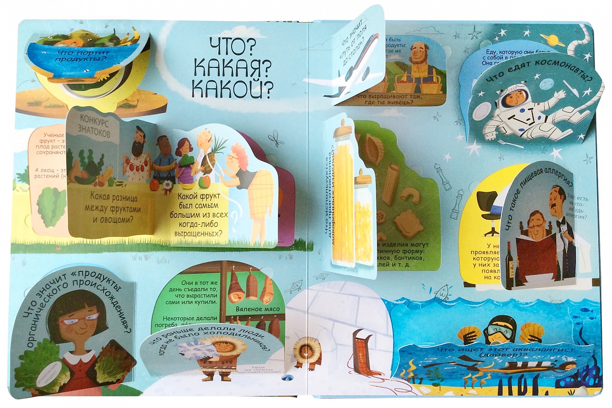 - Яркие и детальные иллюстрации, а также более 60 створок, за которыми скрываются ответы на вопросы о еде.
