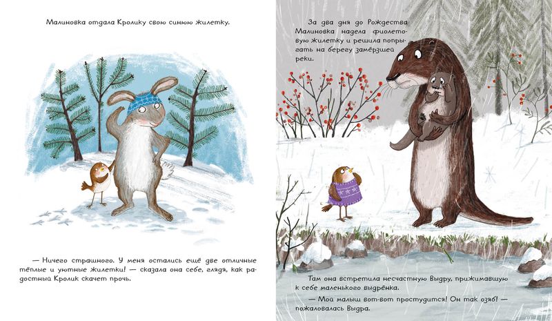 Маленькая Малиновка рада приближению Рождества. Она приготовила себе семь прекрасных тёплых жилеток для праздничной недели! Но разве можно остаться в стороне, когда твои друзья замерзают? Добрая малиновка не раздумывая отдаёт одну жилетку за другой. Неужели в канун праздника она останется без жилетки?..