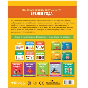 Распределяя по страницам наклейки, дорисовывая и раскрашивая картинки, решая интересные задачи и головоломки, ребенок познакомится с особенностями каждого времени года, концепцией их смены и связанными с ней природными явлениями, узнает много нового о метеорологии, выращивании растений, привычках животных и подходящей для каждого сезона одежды.