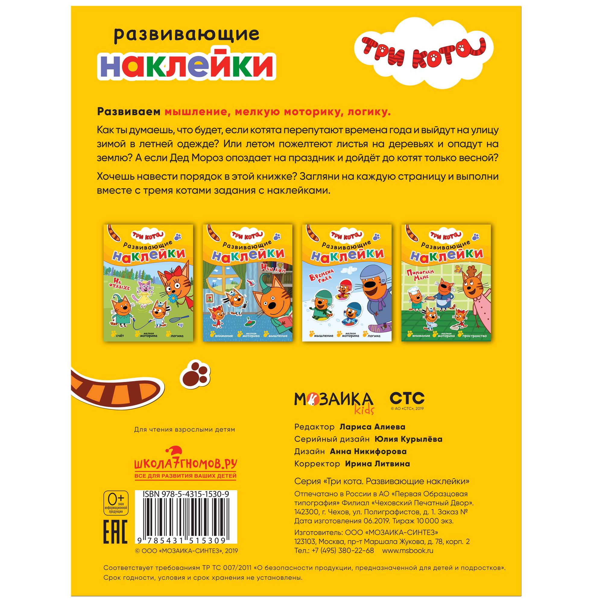 Благодаря удобному формату заниматься по книге «Времена года» из серии «Три кота. Развивающие наклейки» можно где угодно: дома, в поездке, гостях и на прогулке.