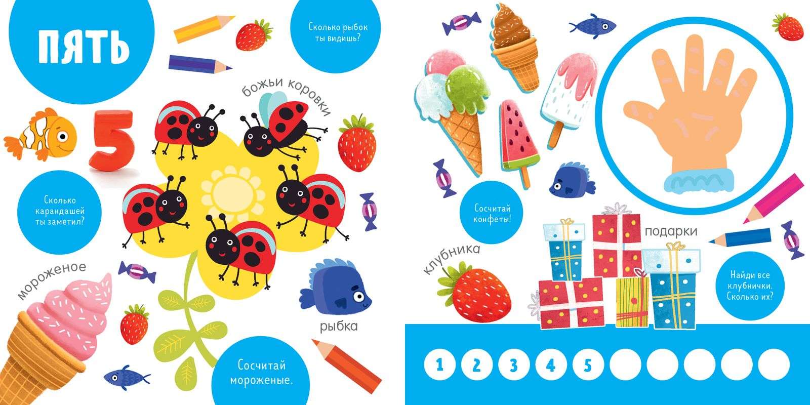 Эта книжка не только развлекательная, но и развивающая. Пока ребенок рассматривает картинки и ищет предметы, он знакомится с разными цветами и узнает названия основных фигур. Причем формат книги «Я ищу числа» подразумевает, что играть и учиться малыш может без помощи родителей, как и во всех книгах серии «Детский сад на ковре».