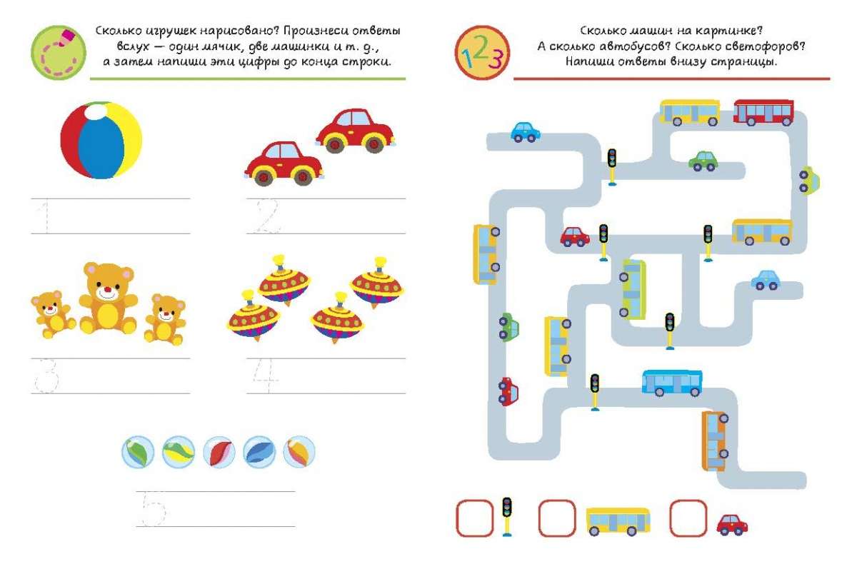 Элементы чистописания, упражнения на обведение линий и рисунок по образцу, раскрашивание собраны в рубриках «Рисуем простые линии», «Изучаем формы», «Учим буквы».