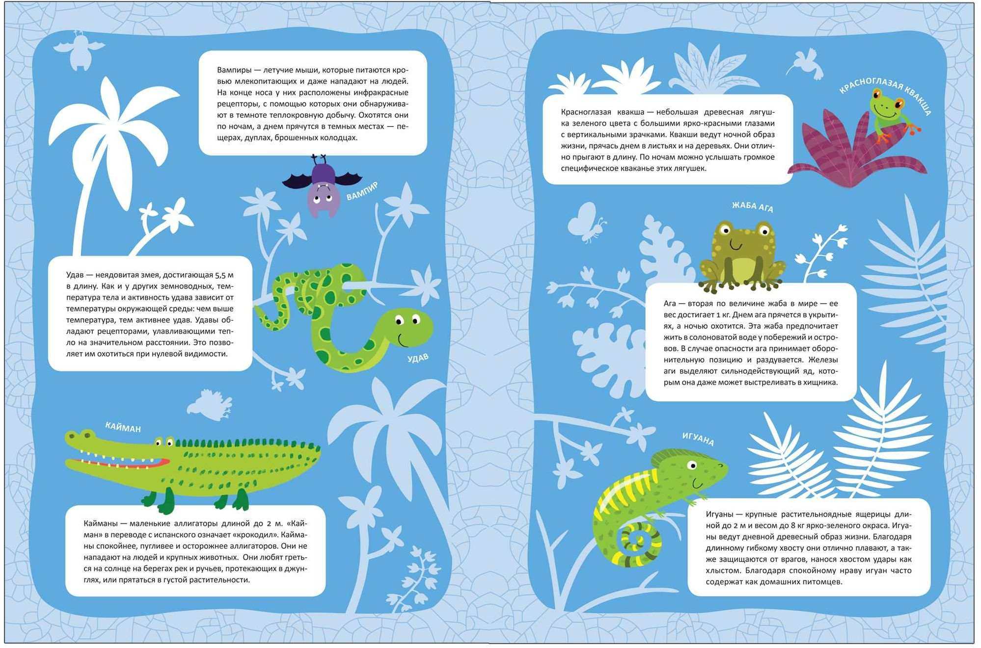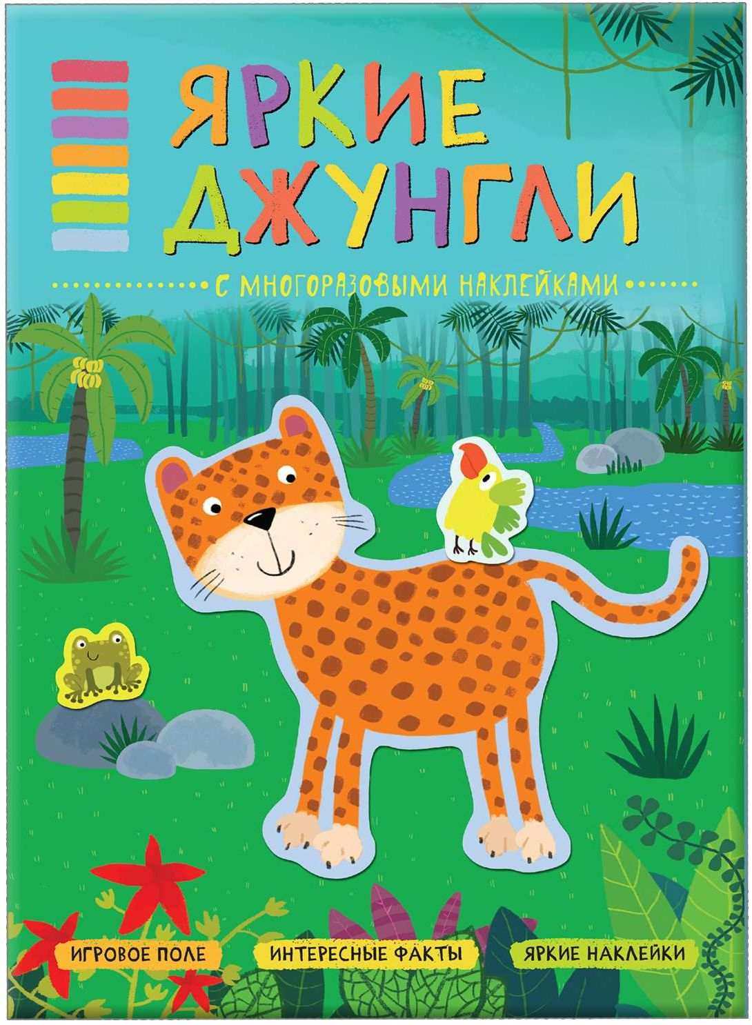Помимо множества занимательных фактов внутри книги малыша ждет сюрприз – большая панорамная иллюстрация с изображением тропического леса. Дополняя ее яркими многоразовыми наклейками – животными джунглей, он не только закрепит новые знания, но и создаст красочный плакат, которым можно украсить стены комнаты.