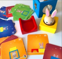 Используя фигурку кролика и три деревянных блока, собирайте конструкции, показанные на карточках с заданиями.