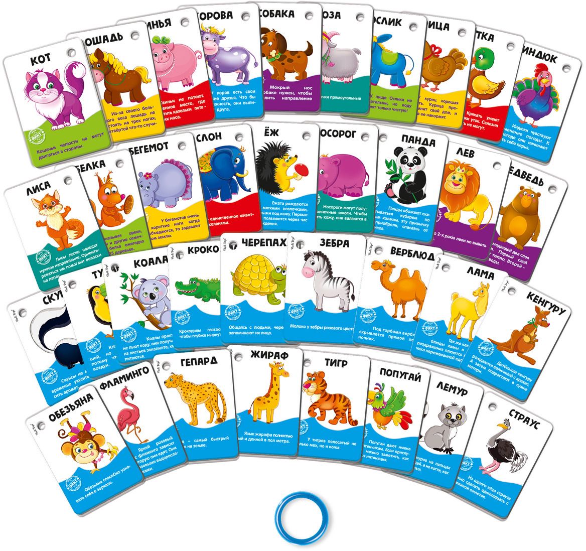 - В наборе ребенок обнаружит карточки из плотного картона с красочным изображением животных.
