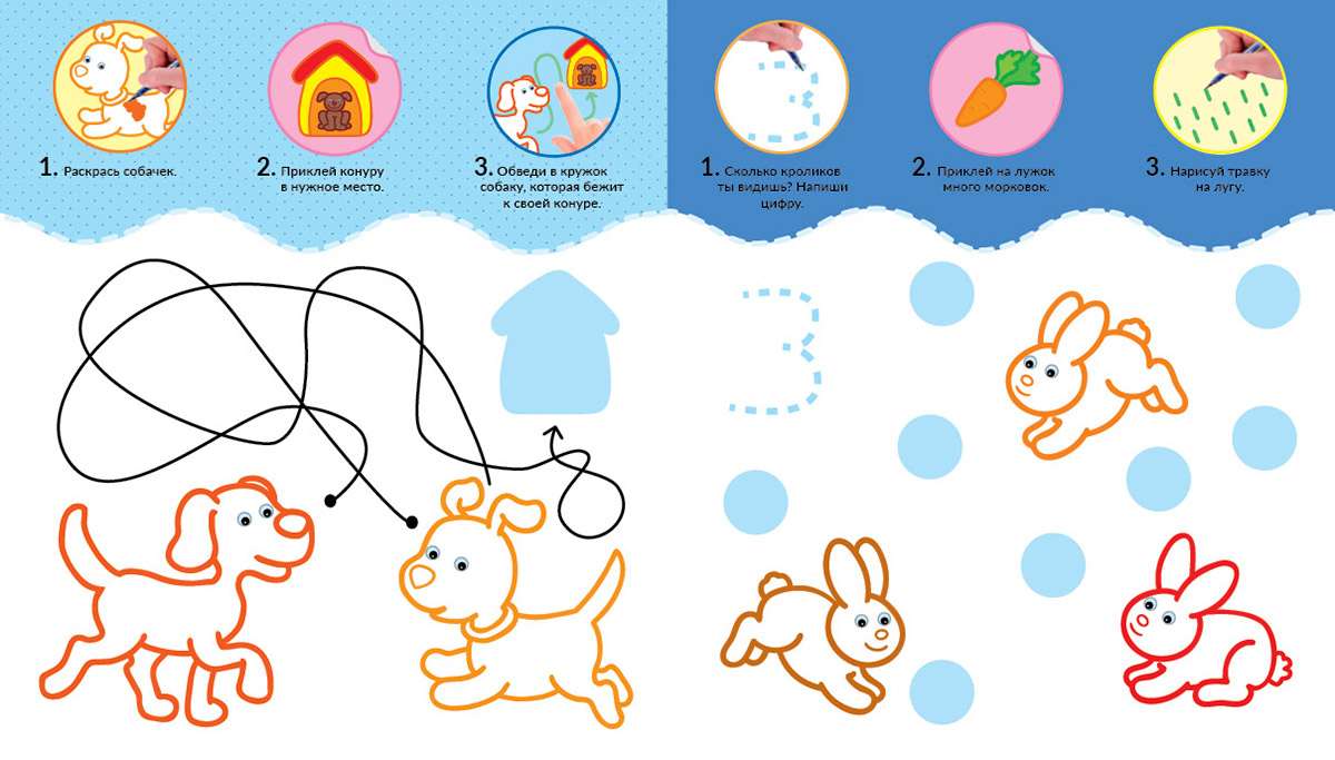 Книга со множеством весёлых заданий стимулирует развитие детей раннего возраста. Интересные и познавательные игры учат детей считать, развивают мелкую моторику, а также знакомят малышей с формами и цветами.