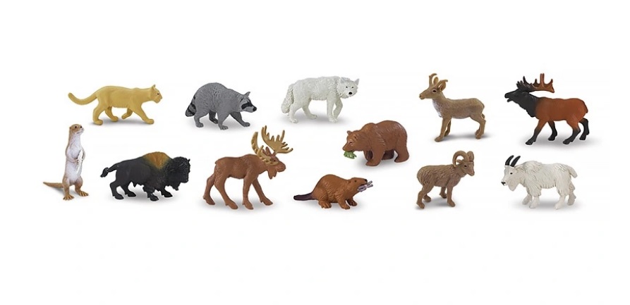 Набор из 12 фигурок животных: пума, волк, благородный олень, снежный баран, бизон, речная выдра, енот, вилорог, лось, медведь гризли и бобр. Размер фигурок варьируется от 4 до 7,5 см. Возраст: 3+