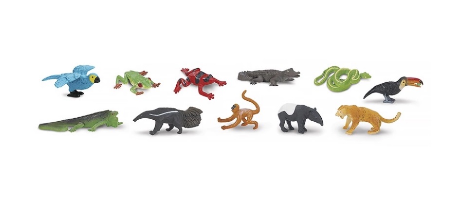 Набор из 11 фигурок животных обитающих во влажных тропических лесах: красный и синий попугай ара красноглазая квакша лягушка древолаз крокодиловый кайман собакоголовый удав большой тукан игуана муравьед коат тапир и ягуар. Размер фигурок варьируется от 4 до 7 5 см. Возраст: 3+