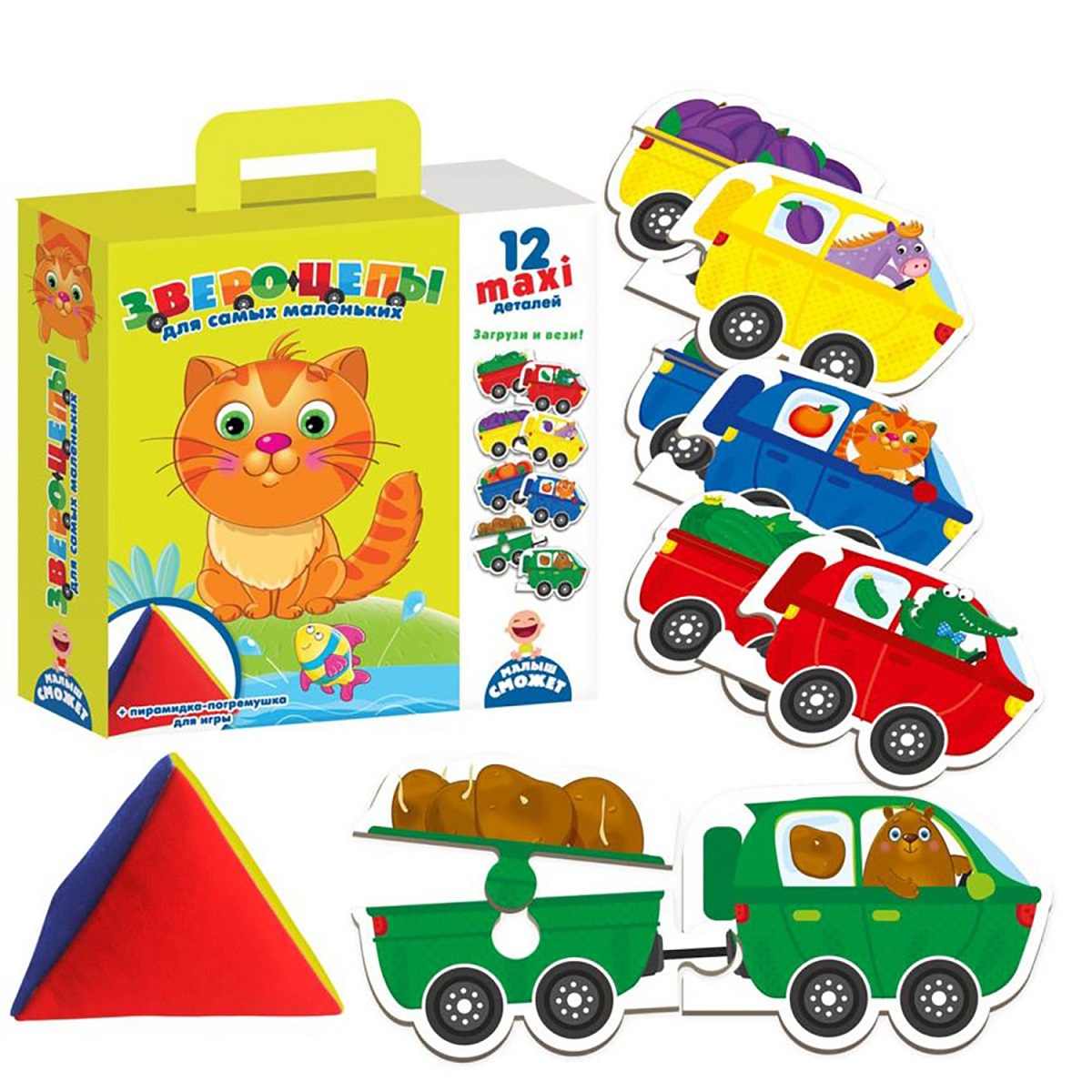 Комплект: 12 макси деталей, пирамидка-погремушка, правила.